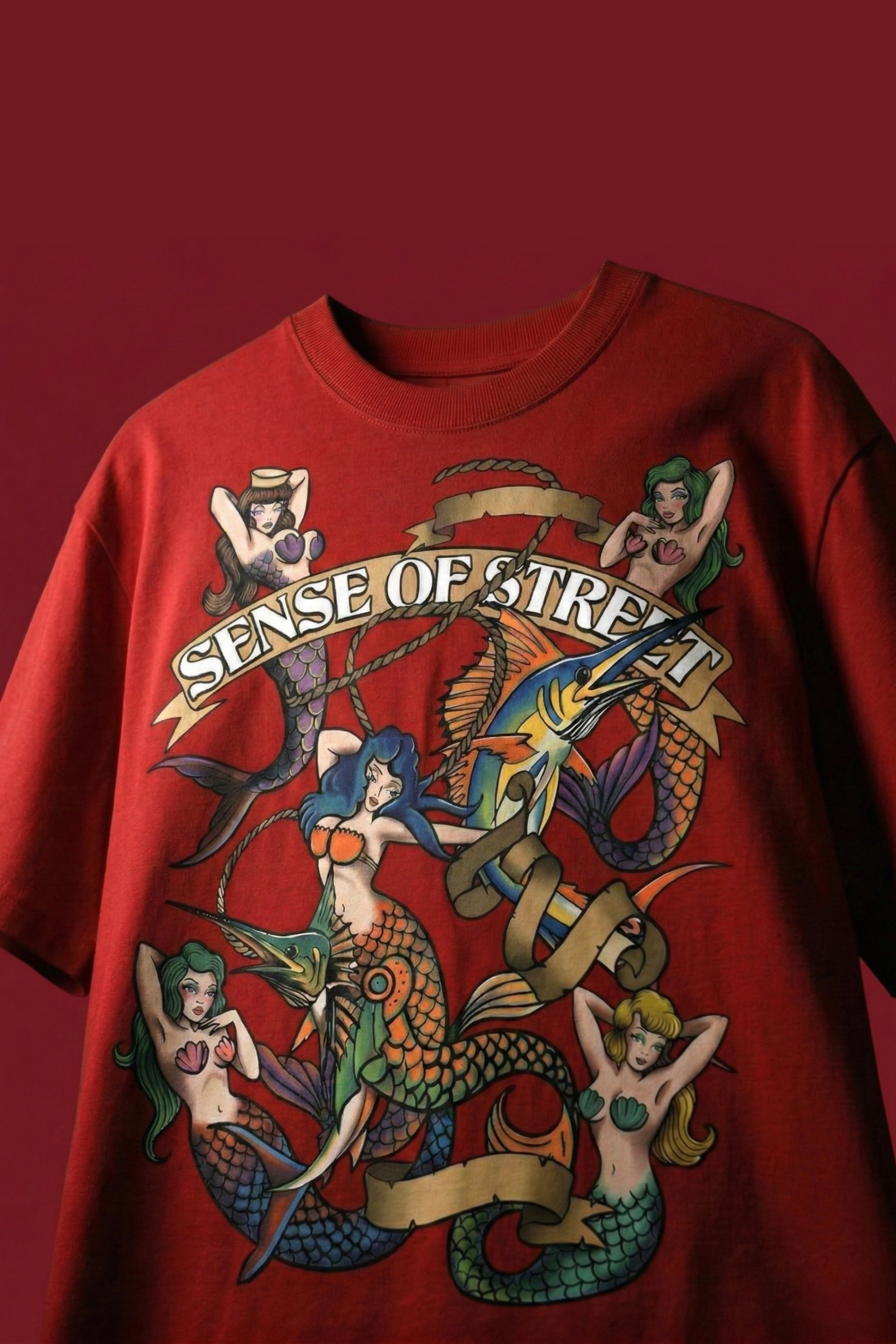 “IT’S A TRAP.” Oversized T-Shirt – a bold statement streetwear piece crafted from premium 240 GSM French Terry (100% cotton). Designed for those who move fearless, this tee draws inspiration from vintage sailor tattoo art and mythic ocean lore. The graphic features striking twin sirens, powerful sea elements, and a bold rope-banner composition that commands attention. It’s not just artwork — it’s a warning. Temptation, allure, and danger wrapped into one unapologetic statement.